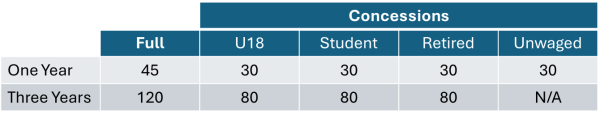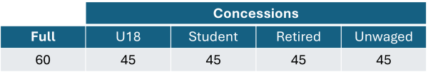 - Unwaged/Student concession requires valid ID or proof of entitlement